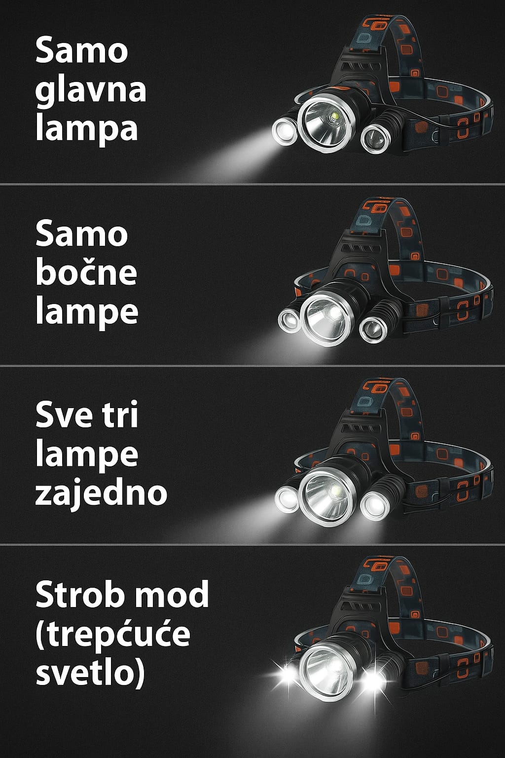 XENOVA lampa je opremljena sa tri odvojene LED lampe (T6 dioda), a vi birate kako će svetleti – samo glavna, samo bočne ili sve tri zajedno. Pored toga, tu je i strob mod za situacije kada je potrebno signalizirati ili skrenuti pažnju.